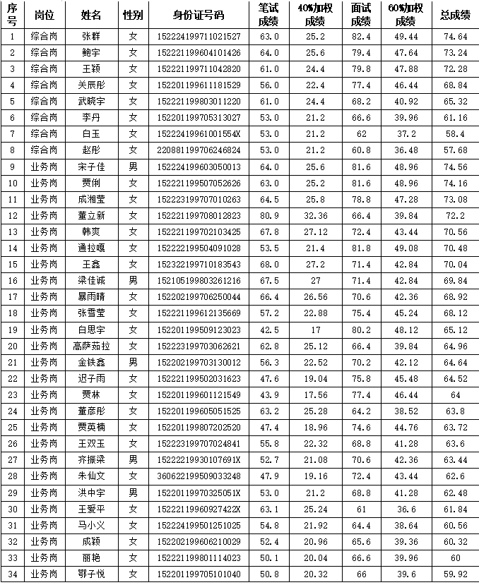 根據(jù)《內(nèi)蒙古農(nóng)村信用社2019-2020年度全區(qū)法人機(jī)構(gòu)應(yīng)屆高校畢業(yè)生校園招聘簡章》要求,2019年12月1日,烏蘭浩特市農(nóng)村信用合作聯(lián)社圓滿完成了2019-2020年校園招聘面試工作?,F(xiàn)將面試人員按筆試與面試4:6比例加權(quán)計(jì)算總成績予以公布(詳見附件)。