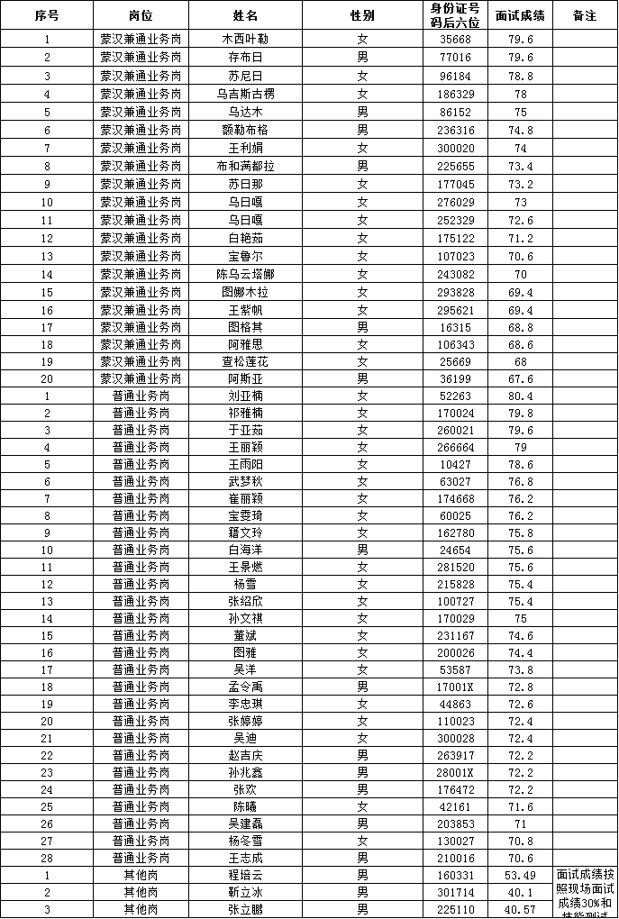 克什克騰農(nóng)商銀行委托內(nèi)蒙古如保誠(chéng)人力資源管理有限公司組織完成了本行2019-2020年應(yīng)屆高校畢業(yè)生校園招聘面試工作,本次面試最終共61人參加,其中蒙漢兼通業(yè)務(wù)崗考生24人、普通業(yè)務(wù)崗考生34人、其他崗籃球?qū)I(yè)3人。根據(jù)首次開(kāi)考比例須達(dá)到招聘計(jì)劃1:3的比例要求,最終確定招聘蒙漢兼通業(yè)務(wù)崗8人、普通業(yè)務(wù)崗11人、其他崗籃球?qū)I(yè)1人。根據(jù)自治區(qū)聯(lián)社文件要求,結(jié)合本行實(shí)際招聘崗位計(jì)劃,在面試結(jié)束后按照招聘崗位的1:2.5的比例確定入圍筆試人員,現(xiàn)將入圍筆試人員名單及成績(jī)進(jìn)行公告。