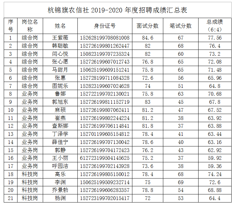 根據(jù)《內(nèi)蒙古農(nóng)村信用社2019-2020年度全區(qū)法人機構應屆高校畢業(yè)生校園招聘簡章》要求,杭錦旗農(nóng)村信用合作聯(lián)社2019—2020年度校園招聘面試筆試全部結束,現(xiàn)將成績公告如下: