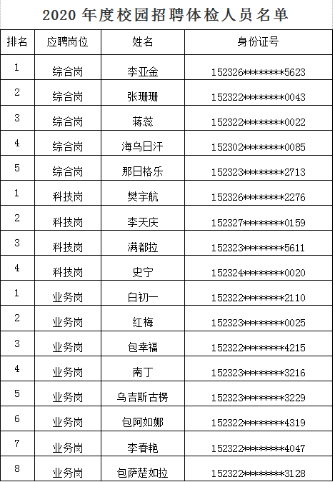 附:2020年度校園招聘體檢人員名單